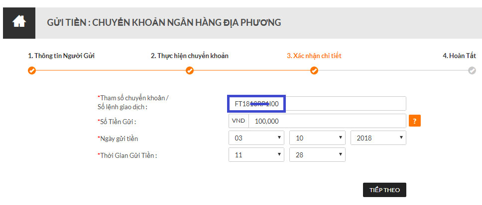 - Sau khi chuyển khoản thành công, "Số giao dịch" sẽ hiển thị tại mục Chi Tiết Giao Dịch như bên dưới: